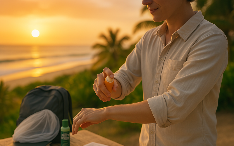 Utilisez des répulsifs cutanés adaptés, dormez sous moustiquaire si nécessaire, et portez des vêtements longs en soirée, surtout dans les zones humides.
