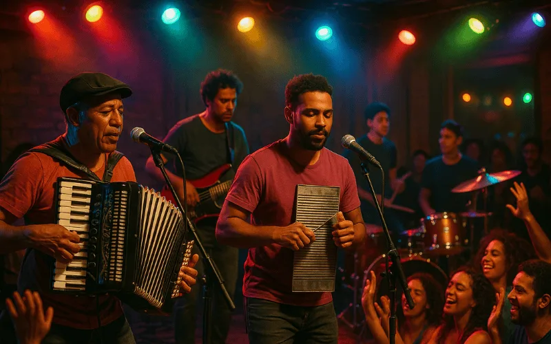 - Instrumentos-chave: o gaita de fole (acordeão diatônico) e o Ferrinho (barra de ferro raspada).